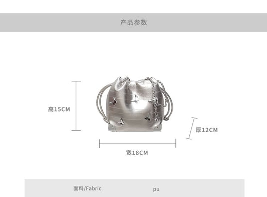 Butterfly Studded Chain Strap Faux Leather Bucket Bag