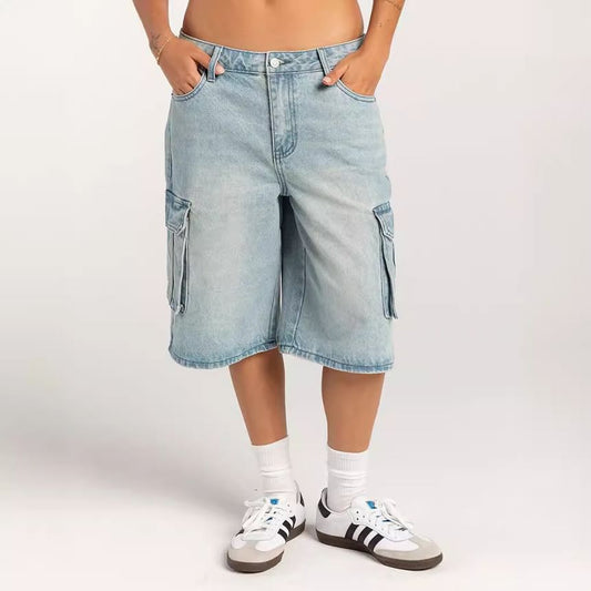 Low Shorts Waist Wide-Leg Pocket Denim Washed