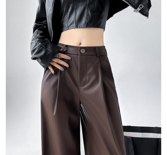 Mid Waist Faux Leather Wide Leg Plain Suit Pants