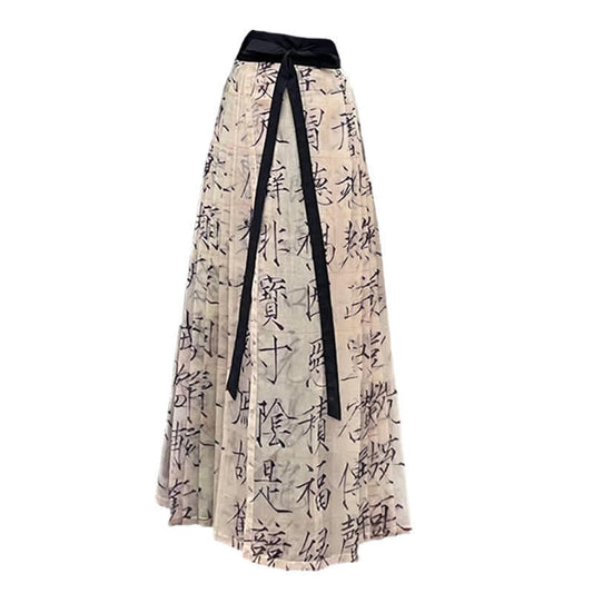 Vintage Character Print Pleated Lace Up Hanfu Skirt