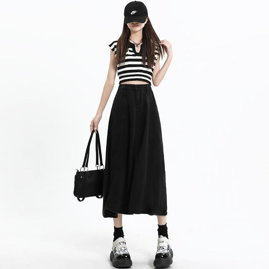 Plain Rise High A-Line Skirt Denim Midi