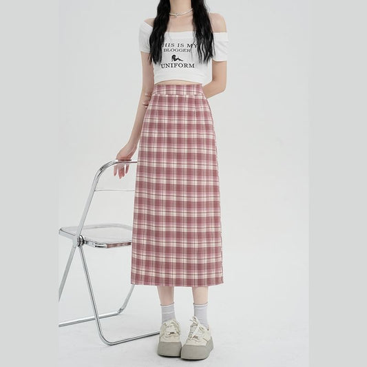 Plaid H-Line High Slit Skirt Midi Waist