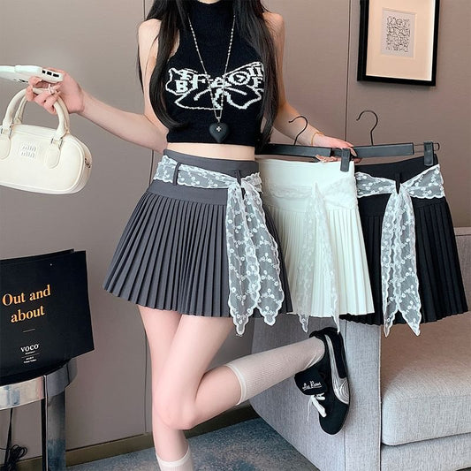 Bow Pinstriped A-Line Pleated Trim Lace Skirt Low Waist Mini