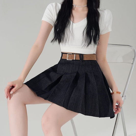 High Skirt Rise Denim Mini A-Line Pleated