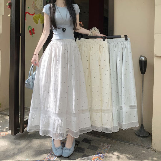 Lace Skirt Midi Panel Waist Elastic A-Line Floral