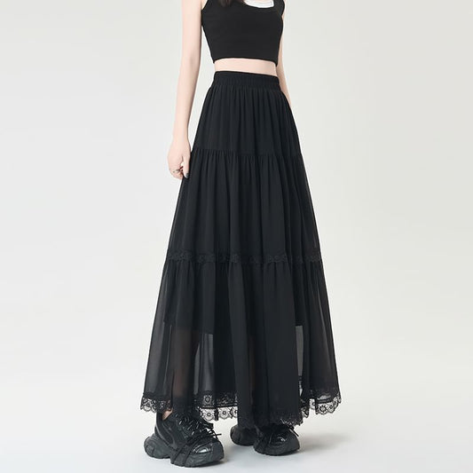 Waist Midi Skirt Plain Lace A-Line Trim Elastic Tiered