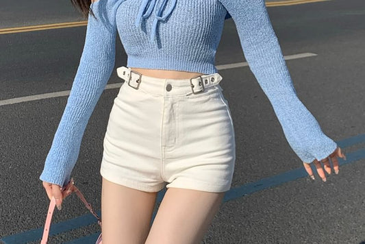 Long-Sleeve Off-Shoulder Plain Slim Fit T-Shirt / High Waist Tiered Mini A-Line Tulle Skirt