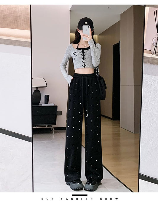 Long-Sleeve Crew Neck Lettering Raglan Crop Slim Fit T-Shirt / High Waist Wide Leg Cargo Sweatpants