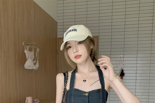 Set: Denim Button-Up Cropped Halter Top + High Waist Wide Leg Jeans