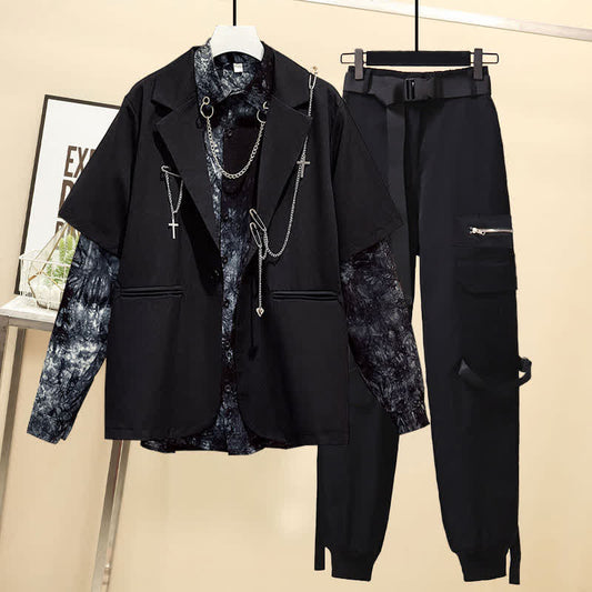 Black Gothic Lapel Blazer Tie Dye Chain Shirt Belted Pants
