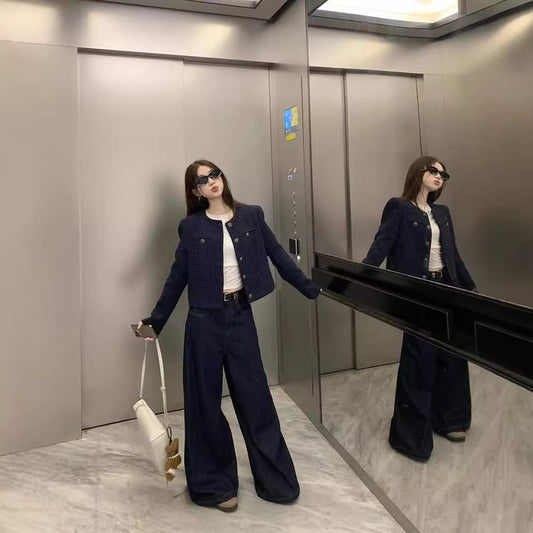 Set: Denim Collar Tweed Button-Up Jacket + High Rise Midi A-Line Skirt
