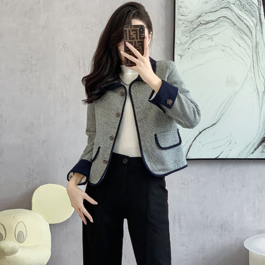 Lapel Collar Two Tone Button Cropped Tweed Jacket