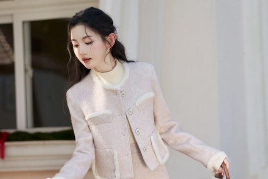 Round Neck Contrast Trim Button Jacket / High Waist Plain Midi A