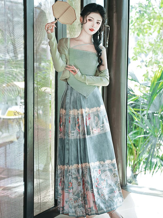 Set: Asymmetrical Plain Camisole Top + Plain Shrug + High Waist Floral Print Midi A