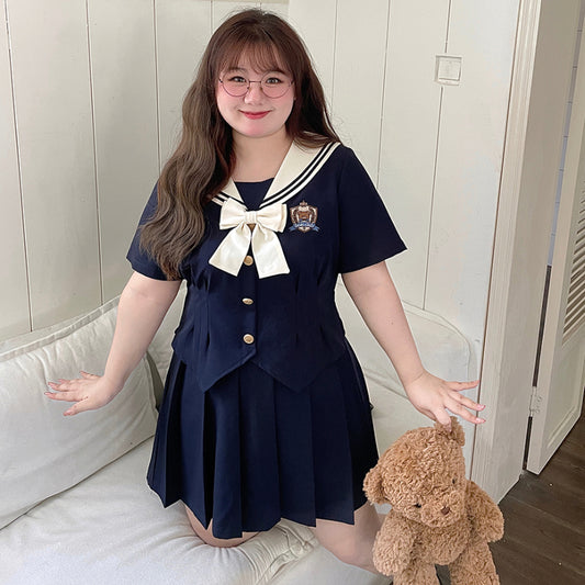 Sweet Plus-size Navy Neck Embroidery Dress Set