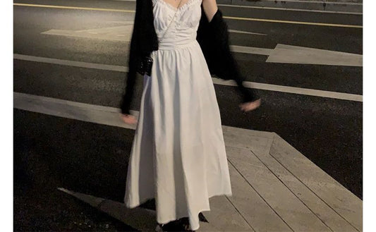 Spaghetti Strap Plain Shirred Midi A-Line Dress / V-Neck Plain Button-Up Cardigan kk24