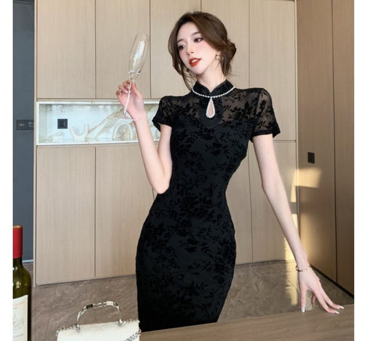Short-Sleeve Floral Print Frog Buttoned Drawstring Midi Bodycon Dress kk36