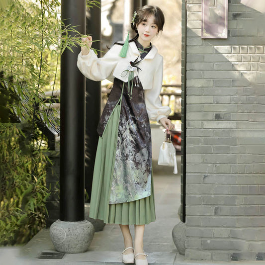 Elegant Bamboo Print Cheongsam Dress Pleated Skirt