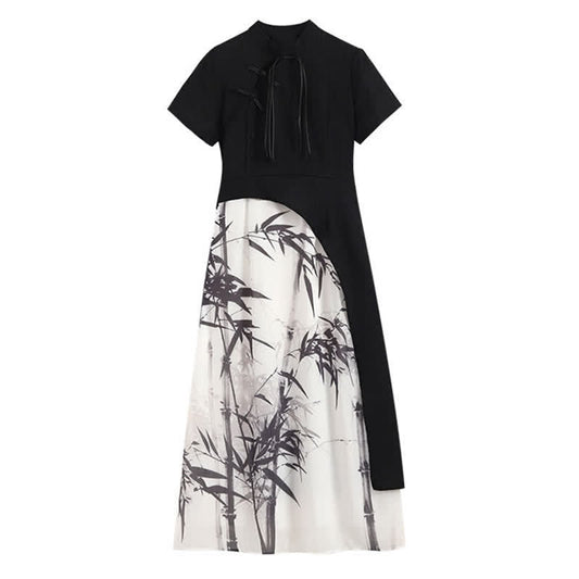 Vintage Bamboo Print Buckle Irregular Cheongsam Dress