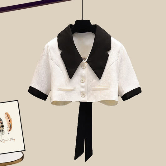 Colorblock V-neck Knit Vest Lapel Pleated Shirt Dress