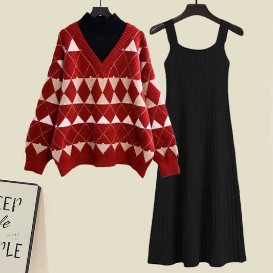 Red Rhombus Plaid Sweatshirt Slip Dress Set