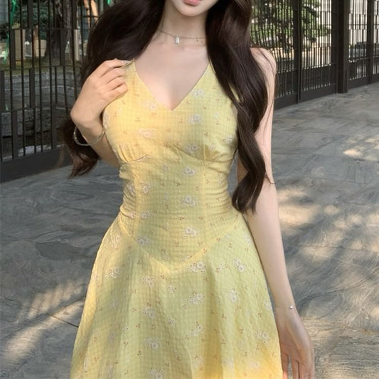 Sundress Spaghetti Trim Lace Strap V-Neck Mini Plain