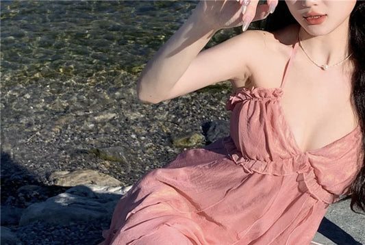 Detail Flower Plain Spaghetti Sundress Maxi Strap Ruffle