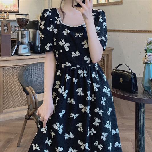 Midi Dress Neck Print Bow Tie Short-Sleeve A-Line Back Square Panel