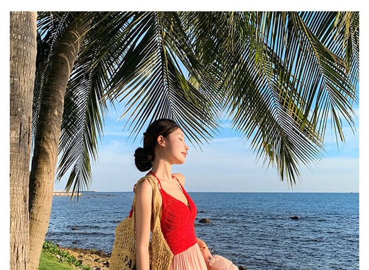 Maxi Plain Halter Dress Front-Slit V-Neck Ruffle A-Line