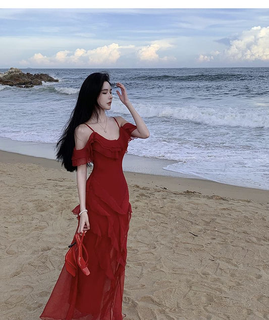 Plain Maxi Ruffle Sundress Cold-Shoulder Asymmetrical