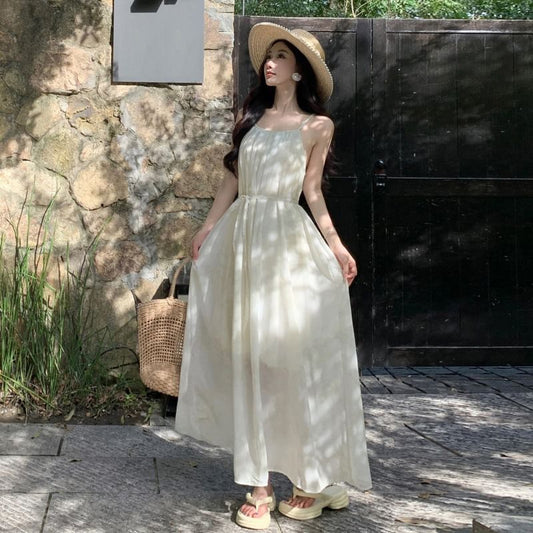 Open Back Dress Maxi Lace Sleeveless A-Line Trim Plain