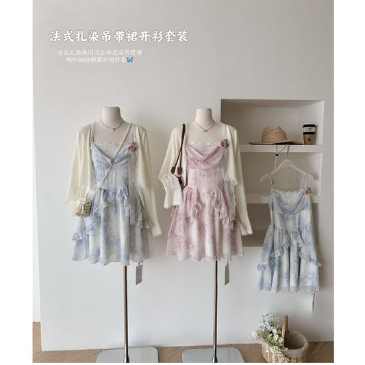 + A-Line Plain Floral Set: Mini Dress Strap Spaghetti Print Cardigan