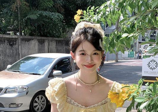 A-Line Mini Dress Sleeve Bow Lace Panel Neck Ruffle Square Short