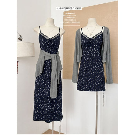 (Various Spaghetti Front Designs) Strap Lace A-Line Floral Dress Open V-Neck Set: Plain + Trim Print Cardigan