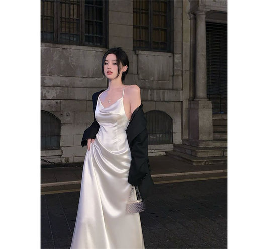 Spaghetti Strap V-Neck Satin Maxi A-Line Dress