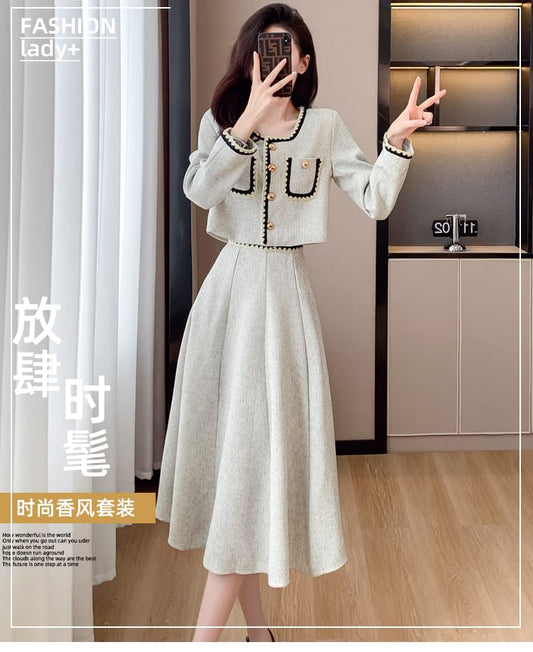 Set: Crew Neck Contrast Trim Button-Up Crop Jacket + High Rise Midi A-Line Skirt