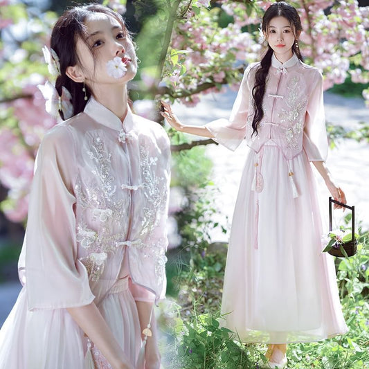 Set: Sleeveless Mandarin Collar Embroidered Top + Camisole Top + High Waist Plain Wide Leg Pants