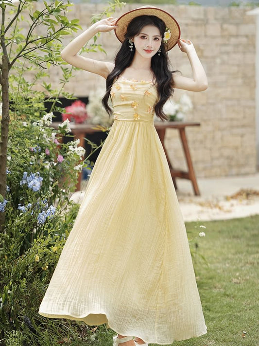 Spaghetti Strap Plain Bow Ruffled Midi A