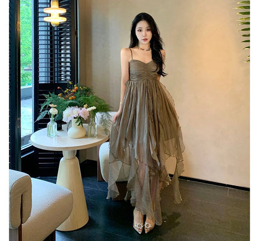Spaghetti Strap Plain Asymmetrical Ruffle Trim Midi A