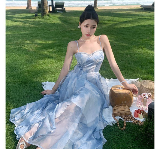 Spaghetti Strap Tie Dye Ruffle Trim Maxi A