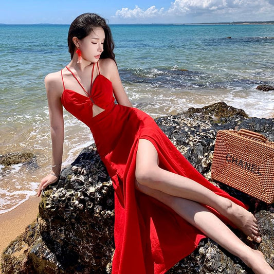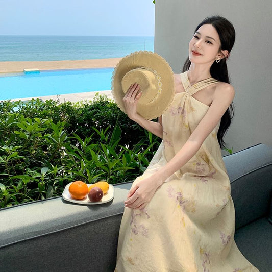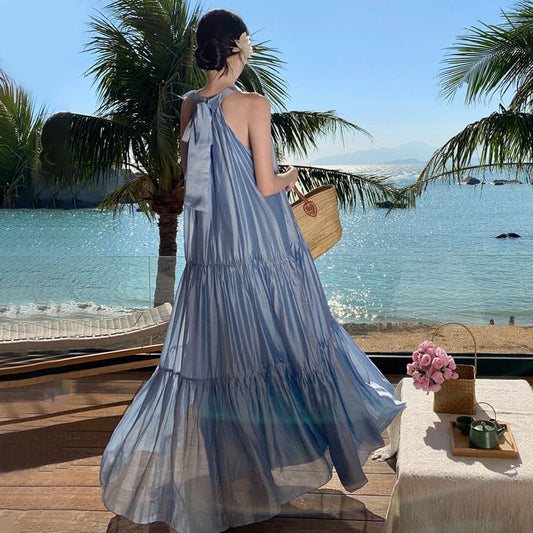 Halter Plain Open Back Slit Ruffle Trim Maxi A