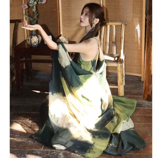 Spaghetti Strap Floral Ruffle Trim Maxi Sheath Dress