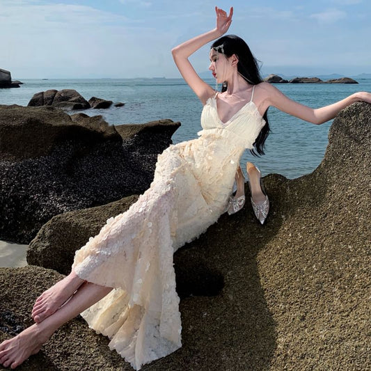 Spaghetti Strap V-Neck Lace Maxi A-Line Dress