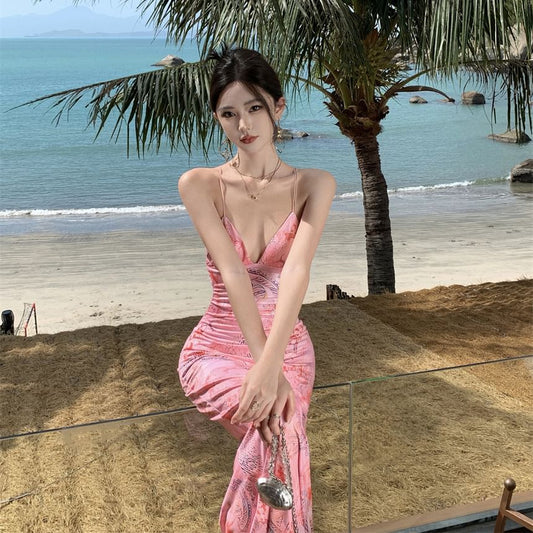 Spaghetti Strap V-Neck Plain Ruched Trained Open Back Maxi A-Line Dress