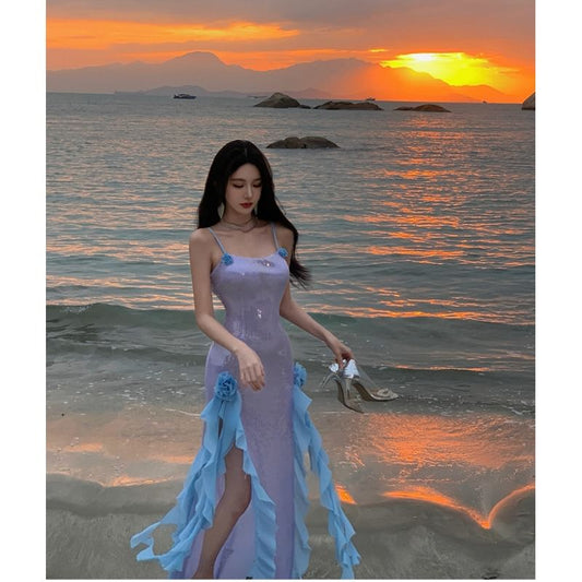 Spaghetti Strap Sequined Ruffled Midi Bodycon Dress