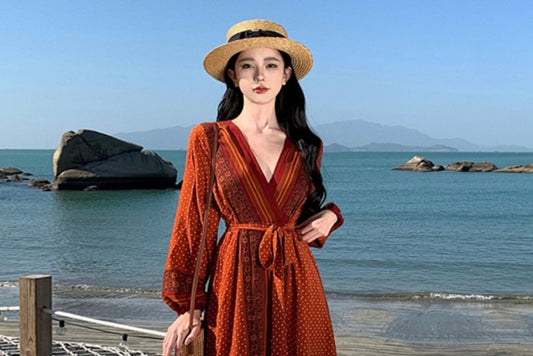 Long Sleeve V-Neck Dotted Patterned Print Tie-Waist Maxi A-Line Wrap Dress