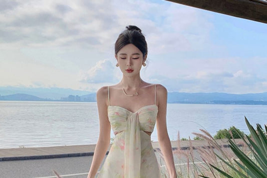 Spaghetti Strap V-Neck Patterned Ruffle Trim Midi A-Line Dress