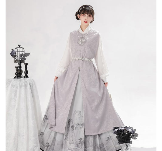 Puff-Sleeve Floral Jacquard Hanfu Top / High Waist Printed Pleated Midi Ma Mian Skirt / Set