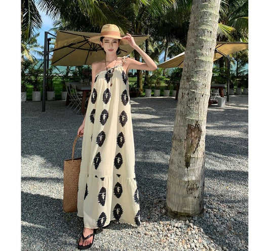 Halter V-Neck Patterned Print Tiered Maxi A-Line Dress