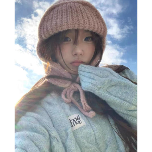 Plain Fleece / Tie-Up Hat Beanie Knit Cable